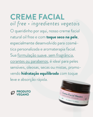 O Creme Facial Neutro Flora Fiora é uma base natural oil free, com que seco na pele, e totalmente vegana especialmente desenvolvida para cosmética personalizada e aromaterapia facial. Sua formulação suave, sem fragrância, corantes, parabenos ou ingredientes de origem animal, é ideal para peles sensíveis, oleosas, secas ou mistas, promovendo hidratação equilibrada com toque leve e absorção rápida.